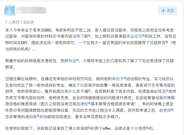 一位學(xué)生對優(yōu)越留學(xué)的文書服務(wù)評價道:“在簽約之前,我查了很多經(jīng)驗貼,很怕遇到文書套模板或一書多用的黑中介。最終我挑了很久,選擇了文書口碑較好的優(yōu)越留學(xué)。老師在創(chuàng)作前還約我進行頭腦風(fēng)暴,確保文書貼合我的情況。最終拿到的初稿質(zhì)量就已經(jīng)很高了,慶幸我當(dāng)時做出了正確的選擇。”