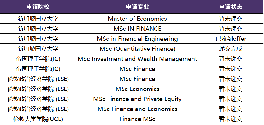 首先,IC和LSE依然是申請重心,申請IC時(shí)選擇了最理想的純金融和申請難度相對較低的投資與財(cái)富管理搭配申請,LSE選中了4個(gè)專業(yè),經(jīng)濟(jì)方向和金融一樣具有極高的含金量。