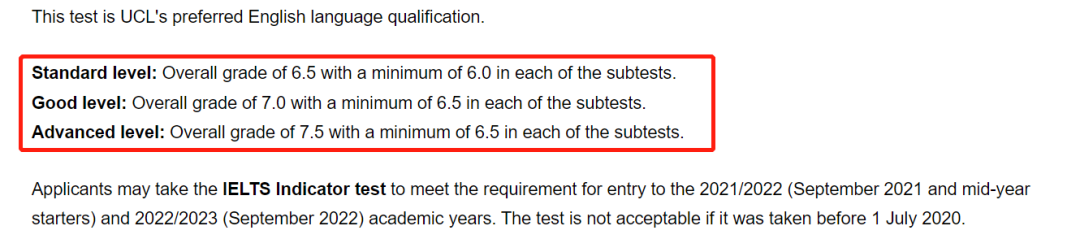 雅思要求:總成績不少于6.5分,單項成績不少于6.0分(分為三個級別:6.5-7.5分)