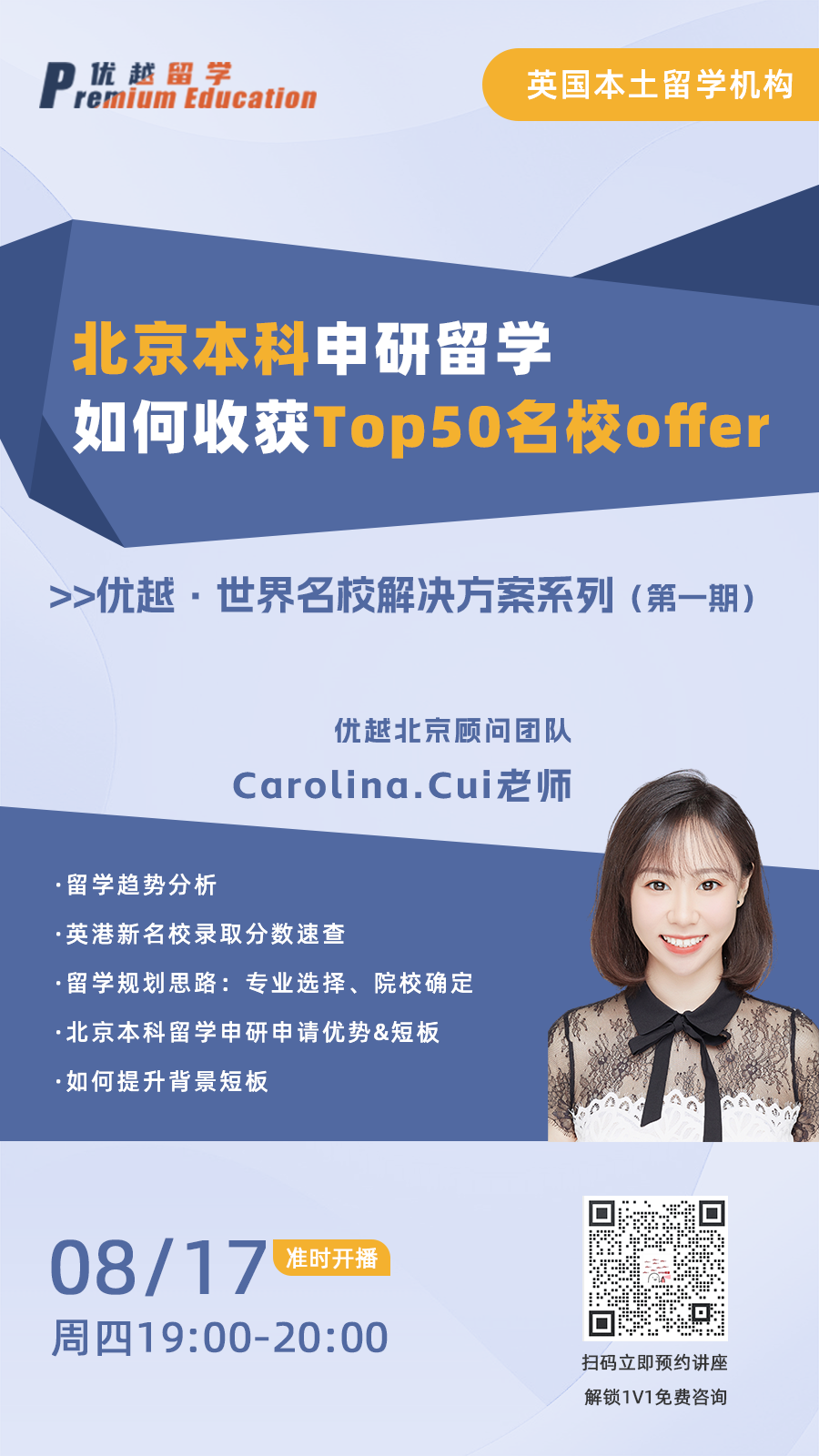 以上是【本期直播預(yù)告:北京本科學(xué)生如何收獲Top50名校offer ??jī)?yōu)勢(shì)和短板詳細(xì)分析!】相關(guān)的全部?jī)?nèi)容,查看更多【直播預(yù)告】相關(guān)資訊可前往【優(yōu)越留學(xué)】首頁(yè)!詳細(xì)申請(qǐng)規(guī)劃及方案定制請(qǐng)預(yù)約優(yōu)越留學(xué)顧問(wèn)為你一對(duì)一解答!