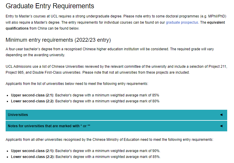 注意官網Notes的提示,一條是針對北師大浸會和港中深定校的,另一條是UCL計算機專業的錄取要求。