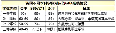隨著英國留學人數的不斷增加,各大學校都提供了詳細的錄取要求,而不同學校甚至同一學校不同專業的申請GPA要求都不相同。英國的GPA算法也相當特殊,及格分數設定為40分,并且不同的GPA對應著不同的學位等級證書。以下是我們根據不同學校背景給出的大致GPA要求,僅供參考。