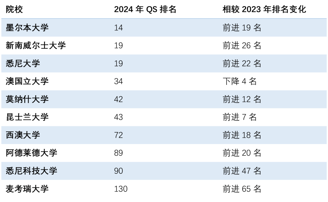 在2024QS世界大學排名的前100名中,澳大利亞的高校占據了9個席位,更是在前50名中占據了6個名額,有3所澳洲大學成功躋身全球前20名。此外,多所澳洲大學的排名也有所上漲。