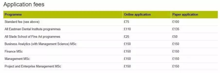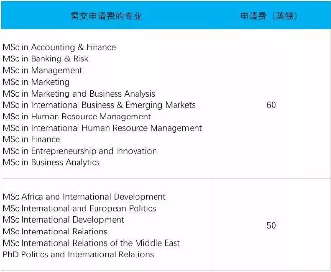 部分專業需要60鎊申請費,如MSc Accounting and Finance、MSc Banking, Regulation and Financial Stability等。