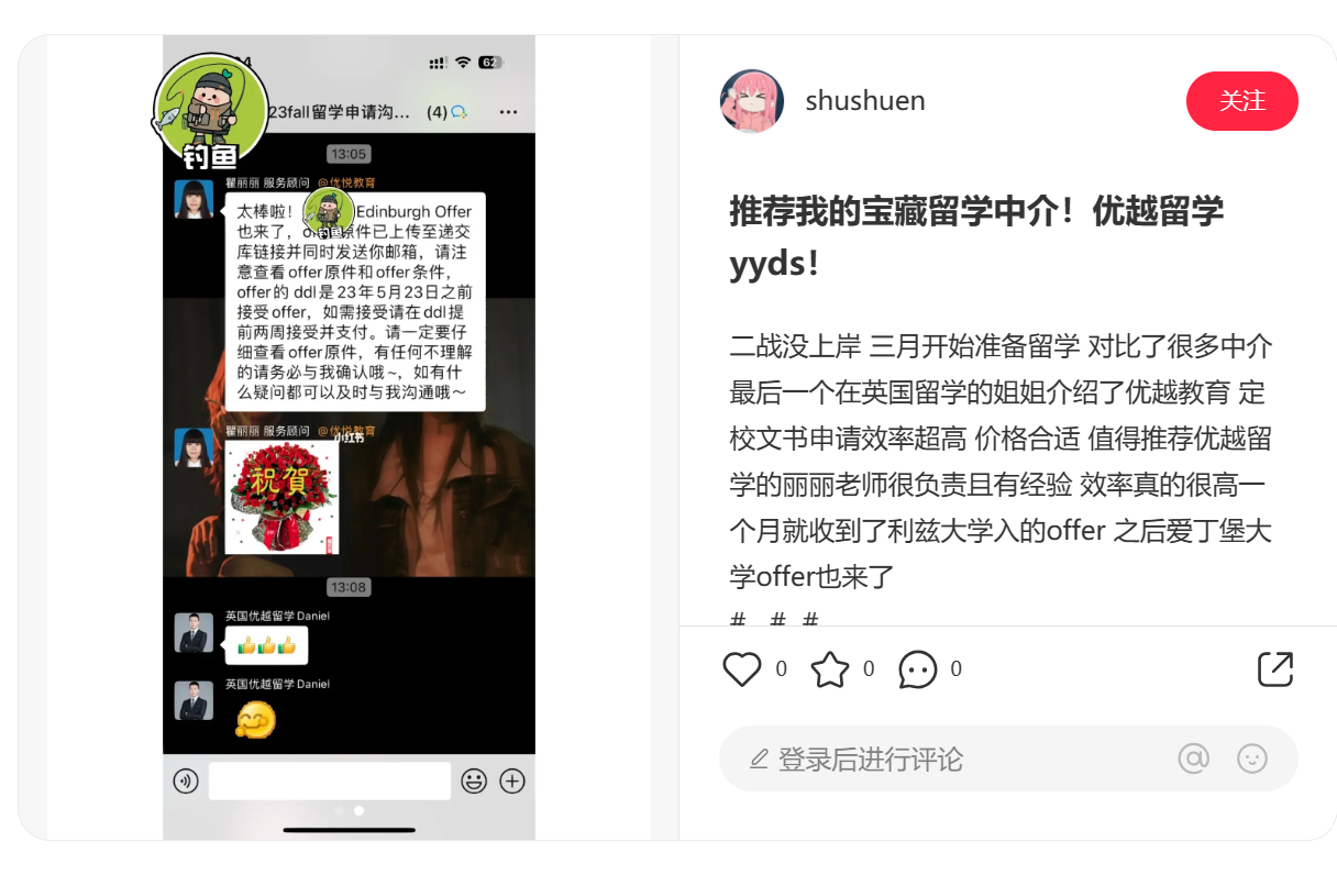 查看中介機構的歷史和聲譽,了解他們在留學行業中的經驗和業績。廣州留學中介的專業知識和聲譽通常可以通過學生評價、成功案例和媒體報道來評估。優越留學一直以來廣受學生好評,尤其在文書方面,他們的表現一直備受認可。