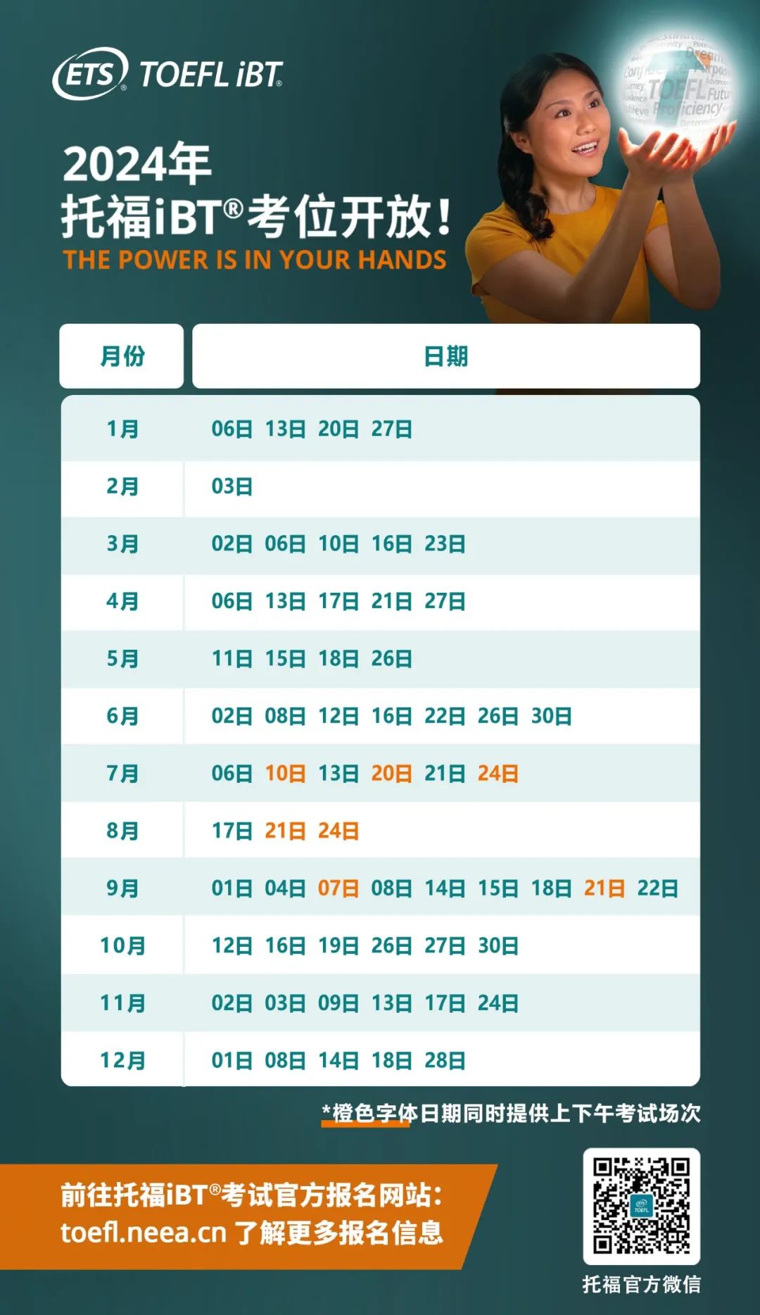 2024年一一托福有61個考試日共計68場考次!GRE有32個考試日的不同考次!雅思可預約上半年計19個筆考日(all周六),158個機考日!