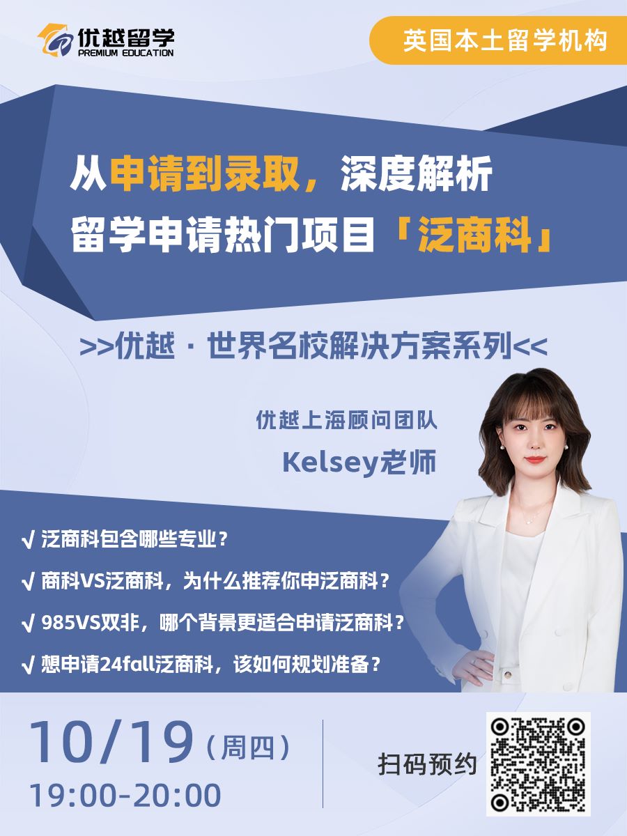 10月19日晚19:00【優越留學】直播間,聽優越上海顧問團隊Kelsey老師分析王愛曼華“深藏blue”的商學院平替專業——泛商科,同學們趕緊拿好小板凳蹲直播!