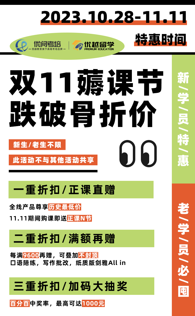 以上是【優閱考培雙十一活動開啟!過往365天最低價,折后低至7.5折!】相關的全部內容,查看更多【考培專欄】相關資訊可前往【優越留學】首頁!詳細申請規劃及方案定制請預約優越留學顧問為你一對一解答!