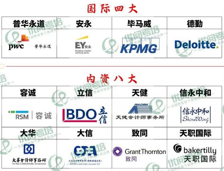 內資八大: 容誠、立信、天健、信永中和、大華、大信、致同、天職國際,是國內最具規模的八家本土會計師事務所,各分所的執業標準要求差別較大,業務范圍廣入行易,積累經驗好去處。