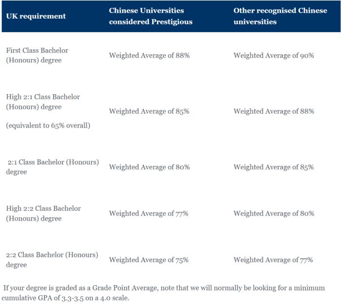 再說申請條件,KCL將中國學校劃分為名校/Prestigious Institution、認可校/Recognised Institution,絕大多數專業要求英本2:1以上學位申請,對應均分見下表!