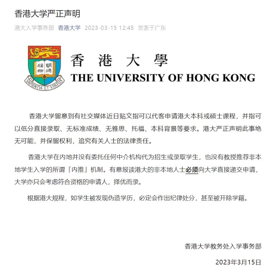 早在2023年3月,香港大學(xué)就已經(jīng)發(fā)布嚴(yán)肅聲明:學(xué)校沒(méi)有任何保錄取業(yè)務(wù),提醒學(xué)生不要相信任何“保錄取”說(shuō)法!