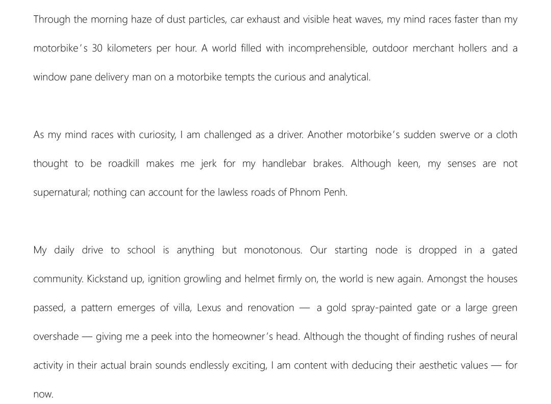 金邊道路上的混亂、不公和歡樂從根本上塑造了我,離開它們后,我只會繼續成長。當我把車開進停車場時,我知道我的教育早在下課鈴響之前就已經開始了。