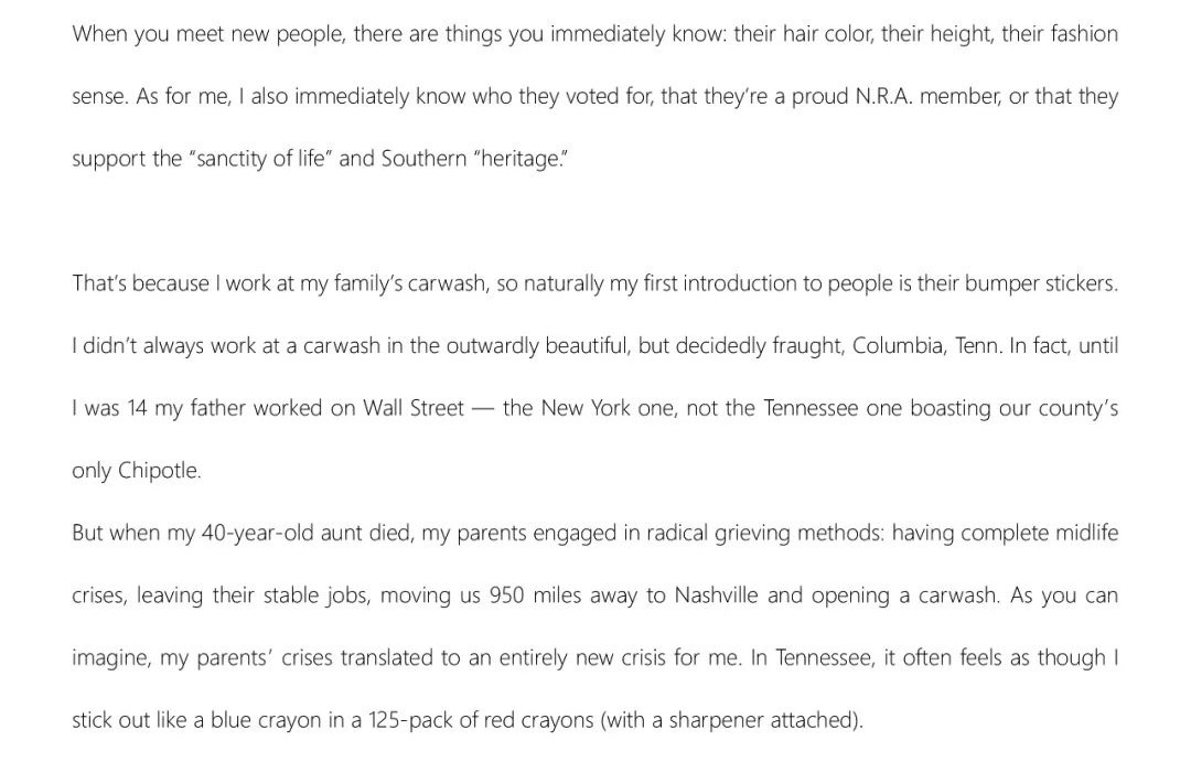 但當我40歲的阿姨去世時,我的父母采取了激進的悲傷方式:經歷了徹底的中年危機,辭去了穩定的工作,把我們搬到950英里外的納什維爾,開了一家洗車店。你可以想象,我父母的危機對我來說變成了一個全新的危機。在田納西州,我經常感覺自己就像125支紅色蠟筆(附帶了一個卷筆刀)中的一支藍色蠟筆。