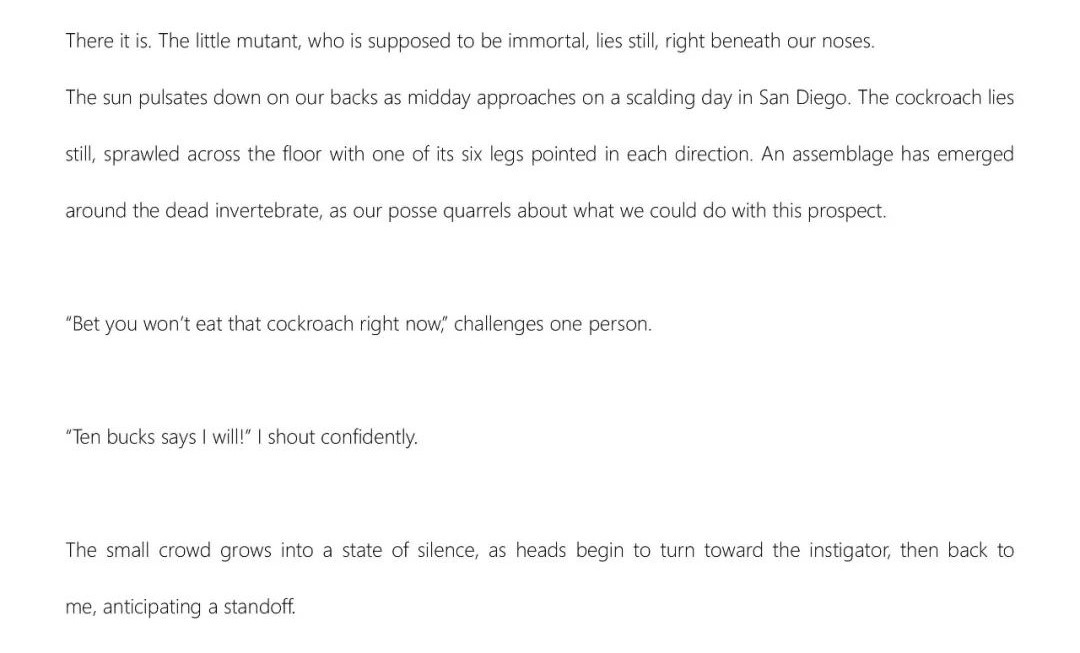 我一直是一個“金錢人”,所以被要求吃一只蟑螂,或者其他類似的要求,以換取貨幣價值是很常見的。我無法解釋為什么10美元會誘使我去征服那些晦澀的壯舉。我有一個幸運的童年,我掙來的錢通常會買一塊士力架巧克力棒供我享受。