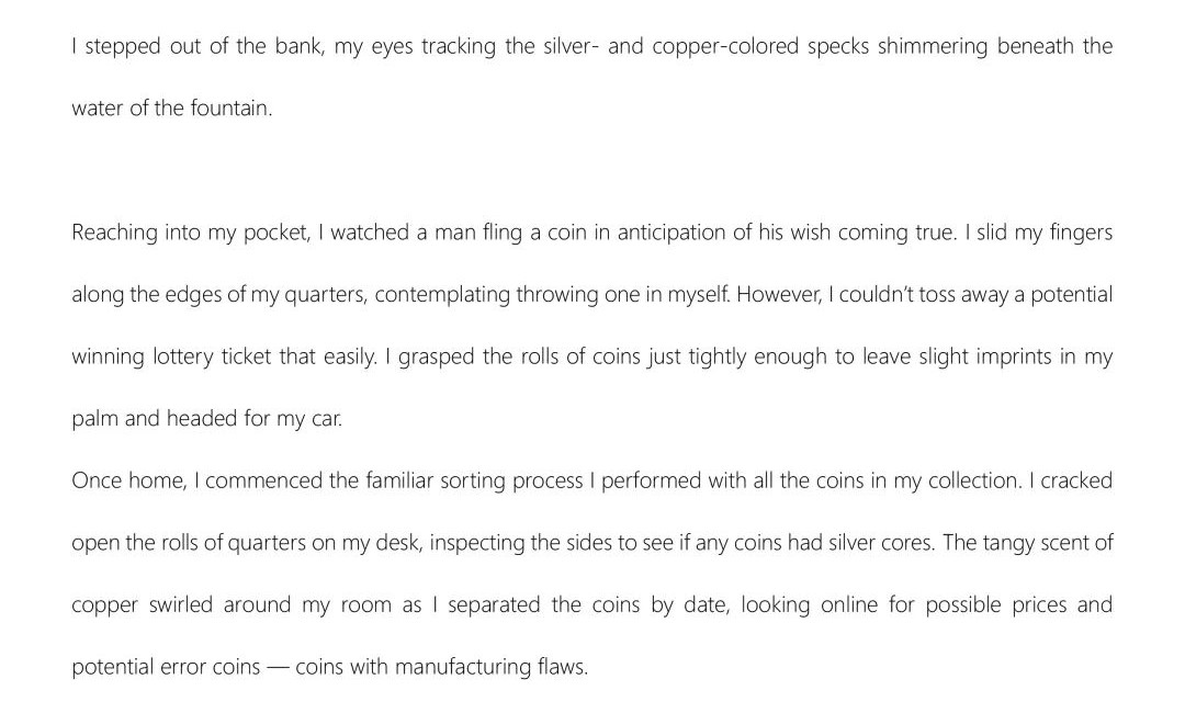 回到家后,我開始對我收集的所有硬幣進行熟悉的分類。我打開桌上的一卷一卷的25美分硬幣,檢查硬幣的側面是否有銀芯。我把硬幣按日期分開,在網上尋找可能的價格和潛在的錯誤幣(有制造缺陷的硬幣),刺鼻的銅味在我的房間里縈繞。