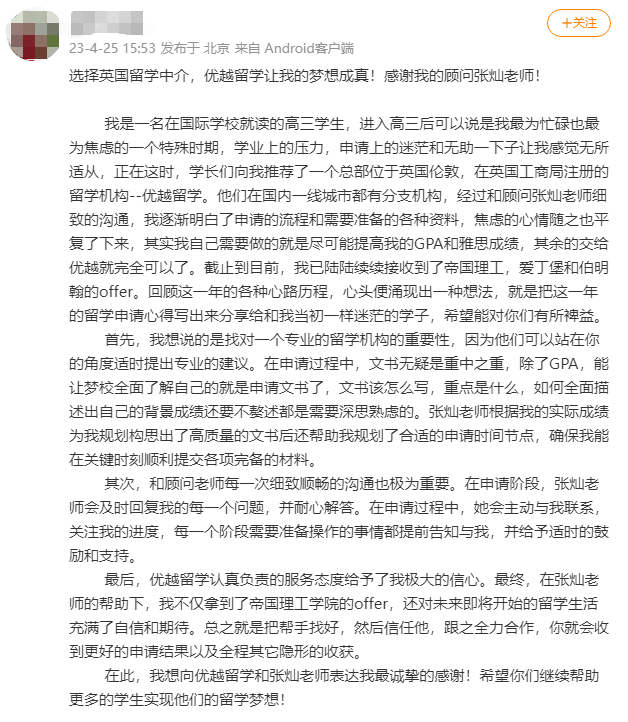 結合兩大團隊的實力和資源,優越留學為每位學生提供專業、個性化的指導和規劃。他們憑借豐富的經驗和專業知識,幫助眾多學生成功叩開了英國名校的大門,實現了他們的留學夢想。