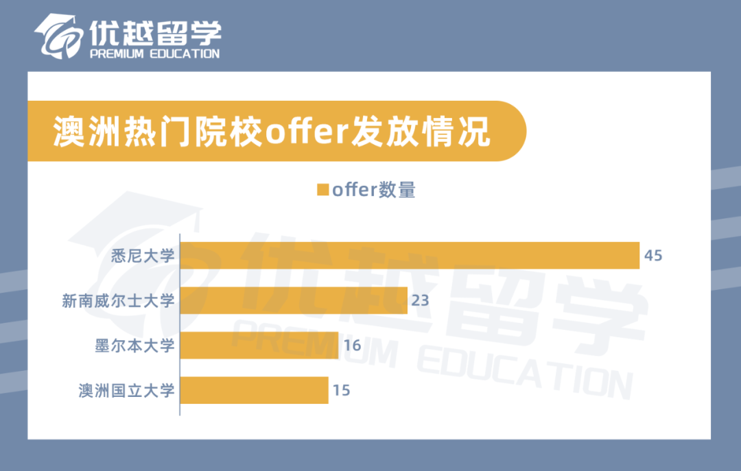 縱觀優(yōu)越去年3-4月的申請數(shù)據(jù),申請澳洲院校的人數(shù)僅次于英國,達到283人次,offer發(fā)放率約為47.3%。比較熱門的幾個院校錄取數(shù)據(jù),優(yōu)越君給大家單獨摘出來了。