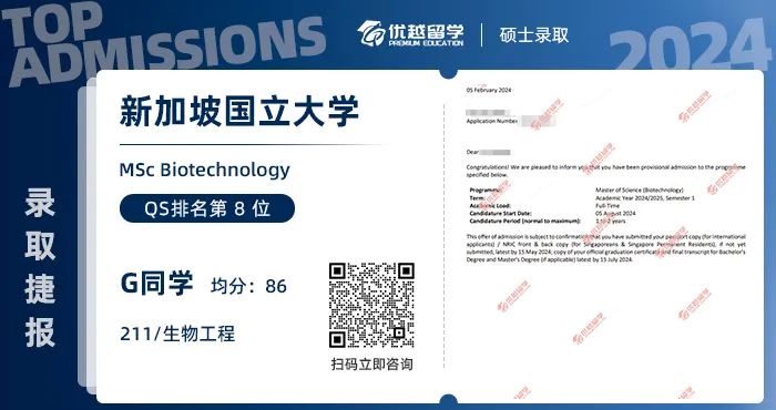 經過多方協同努力,11月,G同學的材料準備完成,院校投遞工作啟動。今年2月,G同學成功拿到新國立的offer,碩士研究生留學圓夢成功!