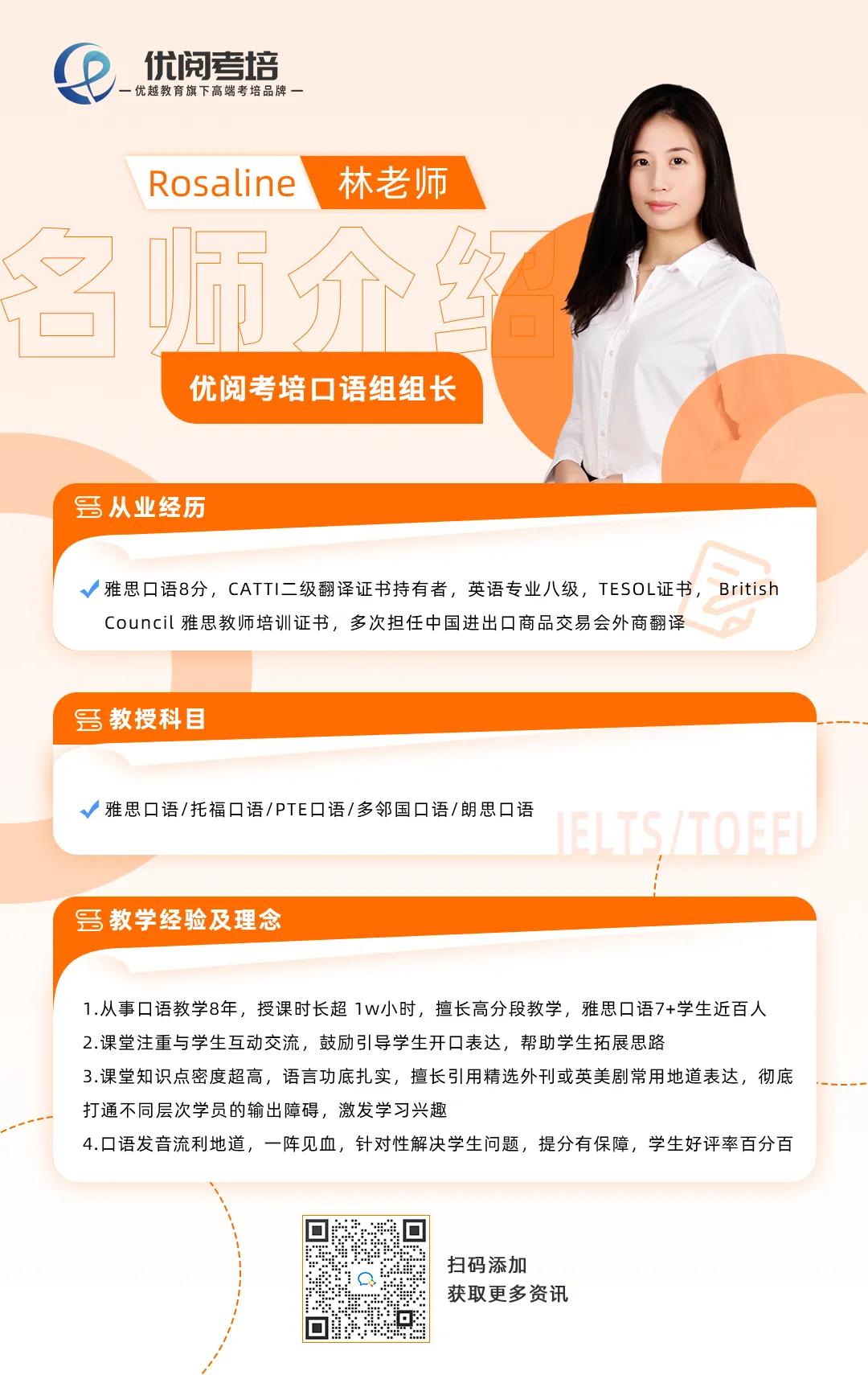 當時負責B學長口語提分的,是優越考培的Rosaline老師,林老師擁有8年的教學經驗,口語發音流利地道,可以針對不同學生的情況進行引導交流。同時,優越還搭配了口語陪練服務,實時答疑,在臨考預測方面也有超高的命中率。