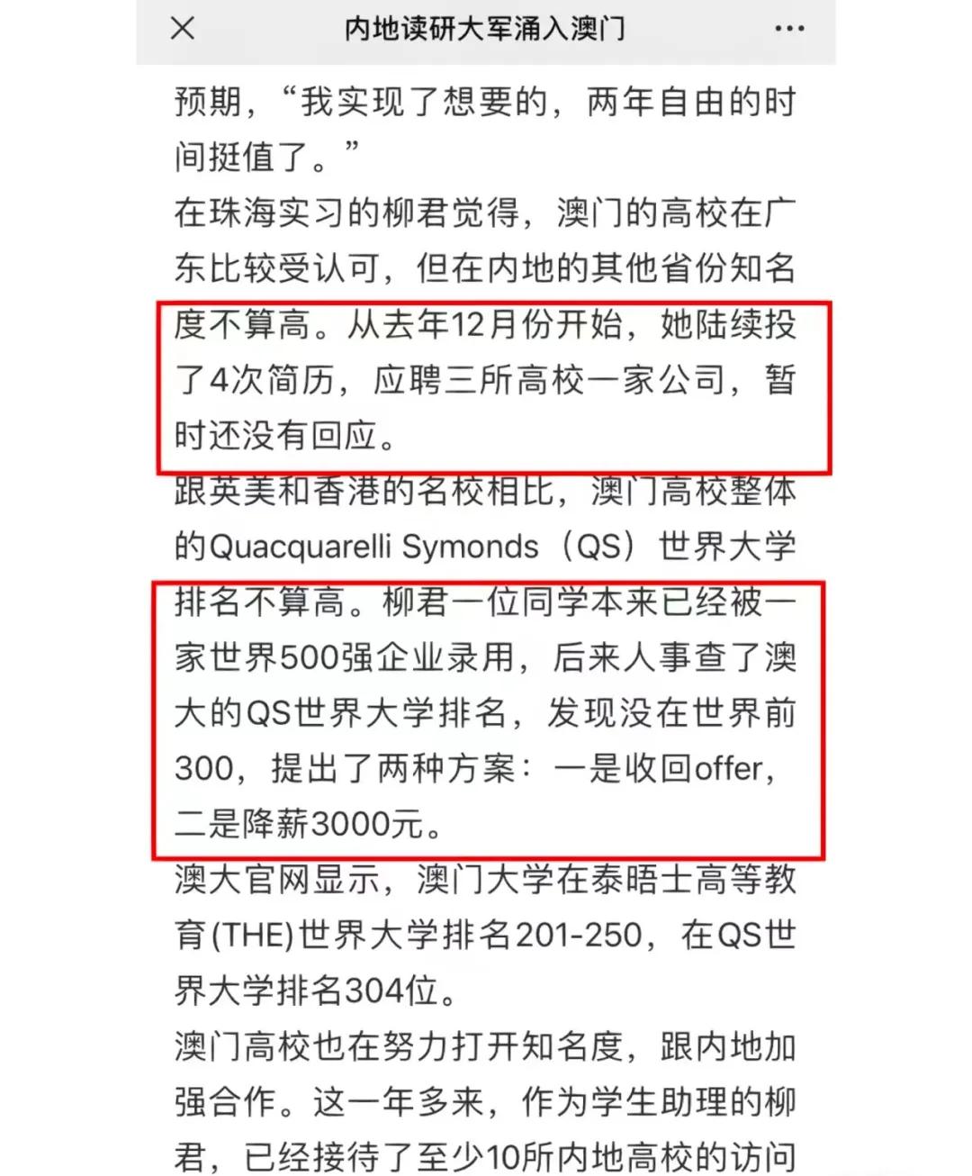 有位出國留學讀研回來的友友向澎湃新聞分享了她的求職經(jīng)歷,因畢業(yè)母校跌出QS300,要么接受降薪3000?要么就收回offer?