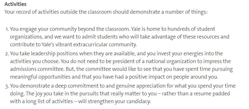 這是美國(guó)跟其他國(guó)家最不一樣的地方。了解過(guò)留學(xué)的人都知道,主流國(guó)家名校都挺看重軟實(shí)力的。但是,美國(guó)光有軟實(shí)力還不行,你還得讓院校體會(huì)到,這是你的興趣所在!耶魯大學(xué)就曾在官網(wǎng)言明:希望你們都是出于熱愛(ài)的目的進(jìn)行的課外活動(dòng),對(duì)自己花時(shí)間做的事情表現(xiàn)出深深的投入和真誠(chéng)的感激,而不是處于“申請(qǐng)”的緣故。
