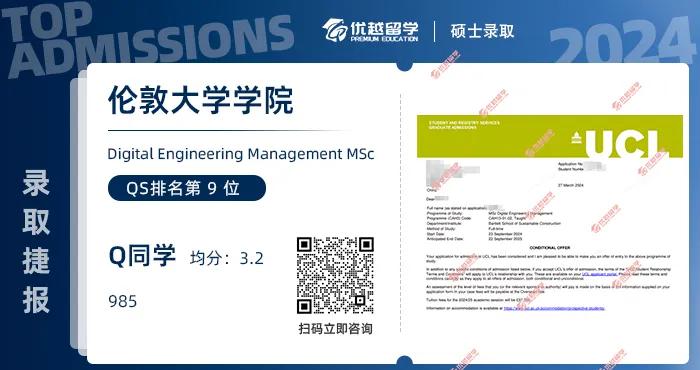 Q學長是在23年初來到優越的,用時近一年的時間,緊跟大數據時代潮流,脫離傳統建筑學舒適圈,小幅跨申上岸UCL數字化工程管理碩士項目。