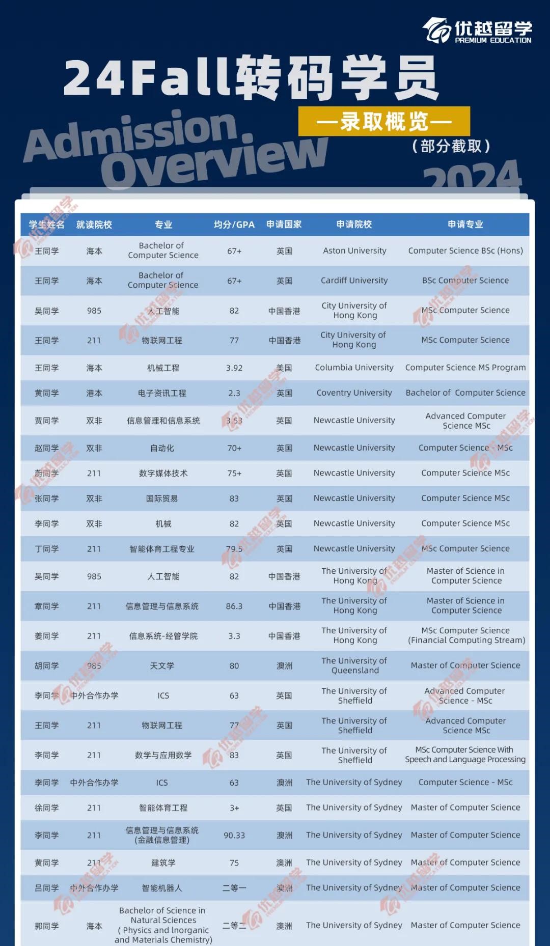 優越君整合了一下24Fall跨申成功的同學背景,除了部分申請了布里斯托CS(convertion)一類專門針對跨專業CS項目的同學外,大部分同學本科階段都是數學、統計、電子信息等理工科背景,也有少數文科生跨申成功。
