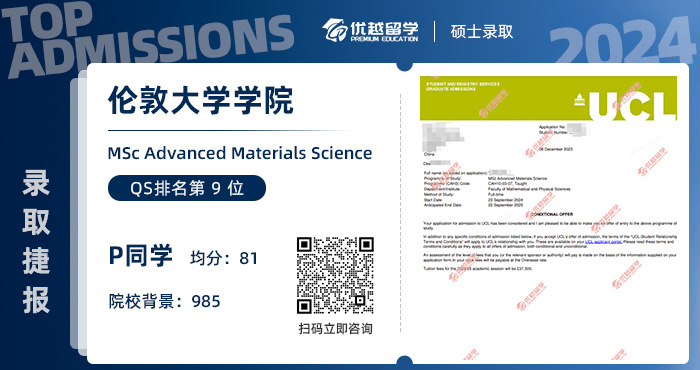 P學(xué)長是去年8月來到優(yōu)越的,經(jīng)過4個月的努力,憑借2段出色的科研項目表現(xiàn),成功打破專業(yè)均分限制,英國碩士研究生上岸UCL先進(jìn)材料科學(xué)碩士項目。接下來,就跟優(yōu)越君一起看看,是什么樣的學(xué)生,能夠打動UCL,降分錄取吧~