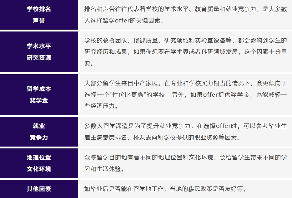 在決定之前,你可以參考一份留學offer考量因素表,從多個維度對各個offer進行權衡和比較。這份表格可以幫助你更全面地了解每個offer的優缺點,從而做出更符合自己實際情況的決策。