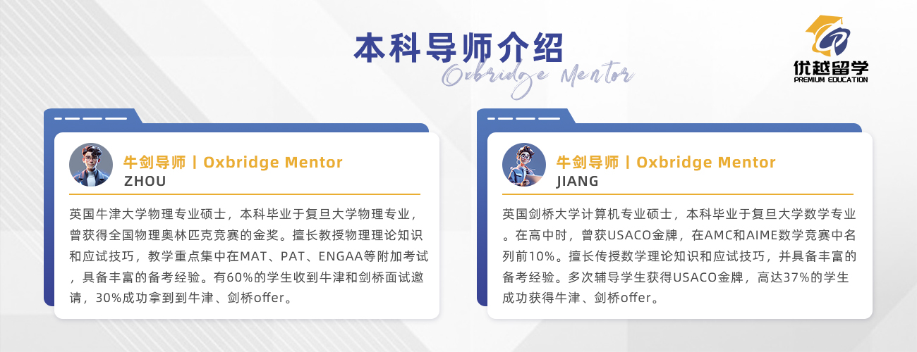 (1)周老師:英國牛津大學(xué)物理專業(yè)碩士,本科畢業(yè)于復(fù)旦大學(xué)物理專業(yè),主修物理化學(xué)。教授課程主攻MAT,PAT,ENGAA等附加考試。高中物理全國奧林匹克競賽金獎。擅長教授理論知識和應(yīng)試技巧,有豐富的備考經(jīng)驗,對學(xué)生要求嚴(yán)格但不失幽默。學(xué)生接受度高,60%牛劍面邀率,30%牛劍申請率。