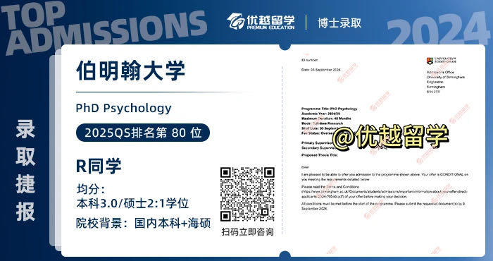 以上是【【博士案例】英碩無縫銜接博士,腳踏實地錄取伯明翰大學心理學PhD!】相關的全部內容,查看更多【博士留學申請】相關資訊可前往【優越留學】首頁!詳細申請規劃及方案定制請預約優越留學顧問為你一對一解答!
