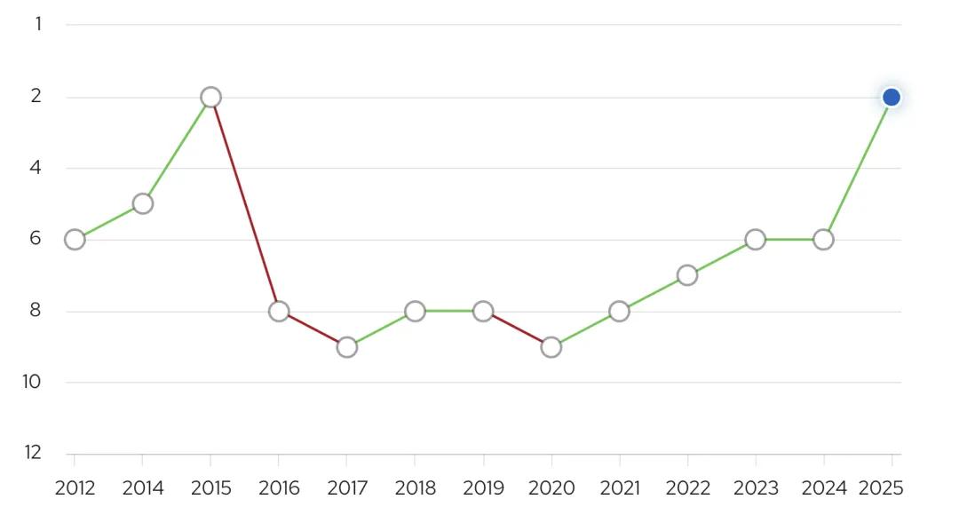 帝國理工學院便是穩中有升的典型代表。從走勢圖我們可以看到,這10年,IC帝國理工學院一直默默發力,幾乎每年排名都在提升,到了今年,更是一躍飛升至第2,重回巔峰!