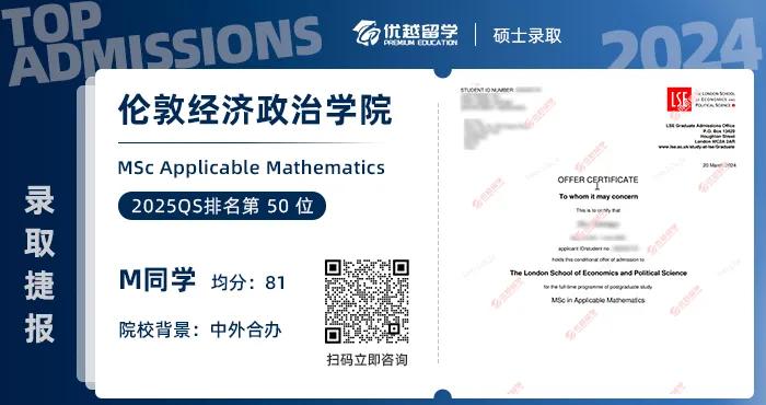 以上是【本期offer榜單:【碩士案例】中外合辦4+0,均分80逆襲上岸倫敦政經LSE應用數學專業(yè) 】相關的全部內容,查看更多【offer榜單】、【名校案例】相關資訊可前往【優(yōu)越留學】首頁!世界名校申請,找優(yōu)越留學!選校定校、申請規(guī)劃、文書寫作、背景提升、方案定制一套搞定!點擊【在線咨詢】,優(yōu)越留學顧問24h在線為您一對一解答!