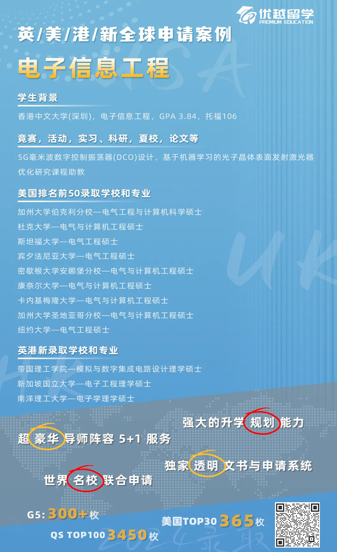 M同學(xué)是自己了解后過來的,對地區(qū)沒有什么要求,就是希望能繼續(xù)攻讀電子信息相關(guān)專業(yè),并且希望院校和專業(yè)排名都靠前。她的硬背景還是很不錯的,港中文的電子信息,績點有3.8左右,很有機(jī)會沖刺英美TOP10的,就是軟背景還有所欠缺。