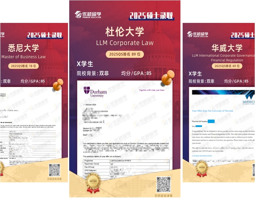 以上是【本期offer榜單:【碩士案例】雙非強勢逆襲!25fall手握6份top100法學offer! 】相關的全部內容,查看更多【offer榜單】、【名校案例】相關資訊可前往【優越留學】首頁!世界名校申請,找優越留學!選校定校、申請規劃、文書寫作、背景提升、方案定制一套搞定!點擊【在線咨詢】,優越留學顧問24h在線為您一對一解答!