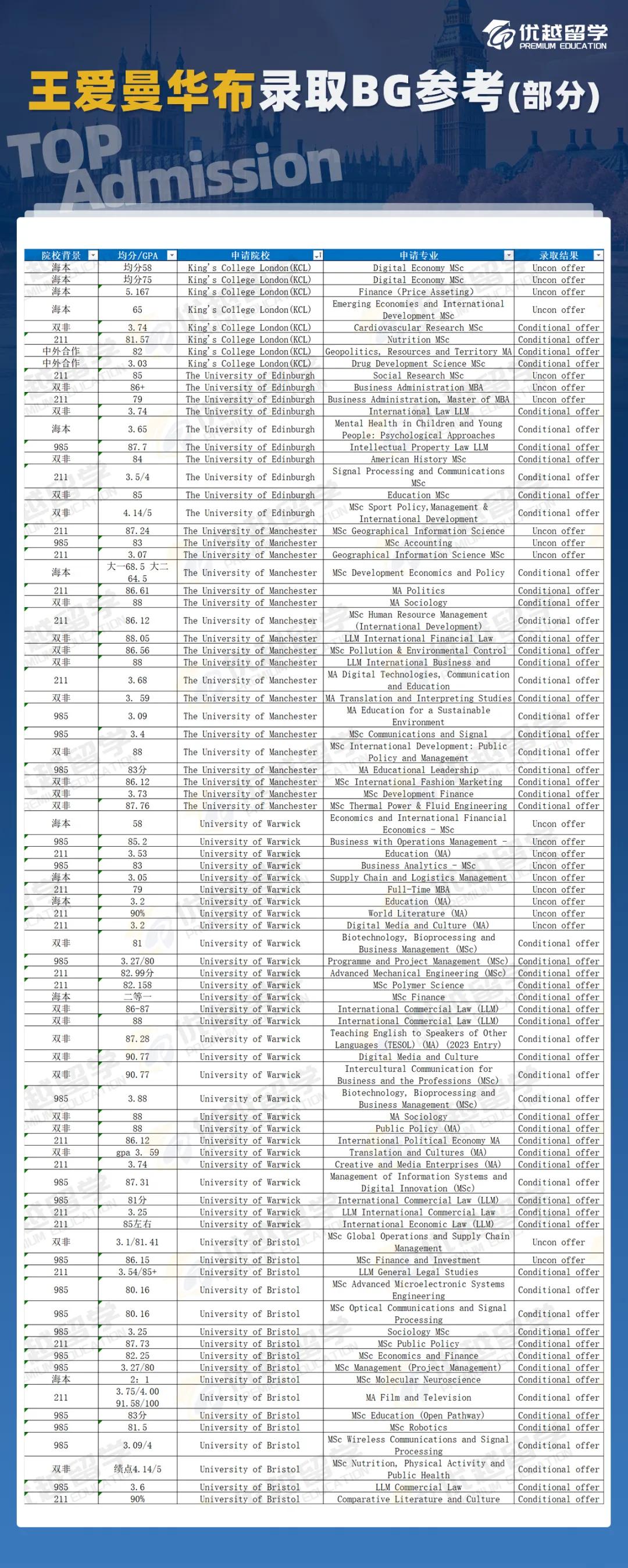 為了方便同學們直觀了解這5所院校不同專業的BG、成績要求,優越君從24Fall及25Fal目前錄取學員中做了部分截取,大家可以做個參考。