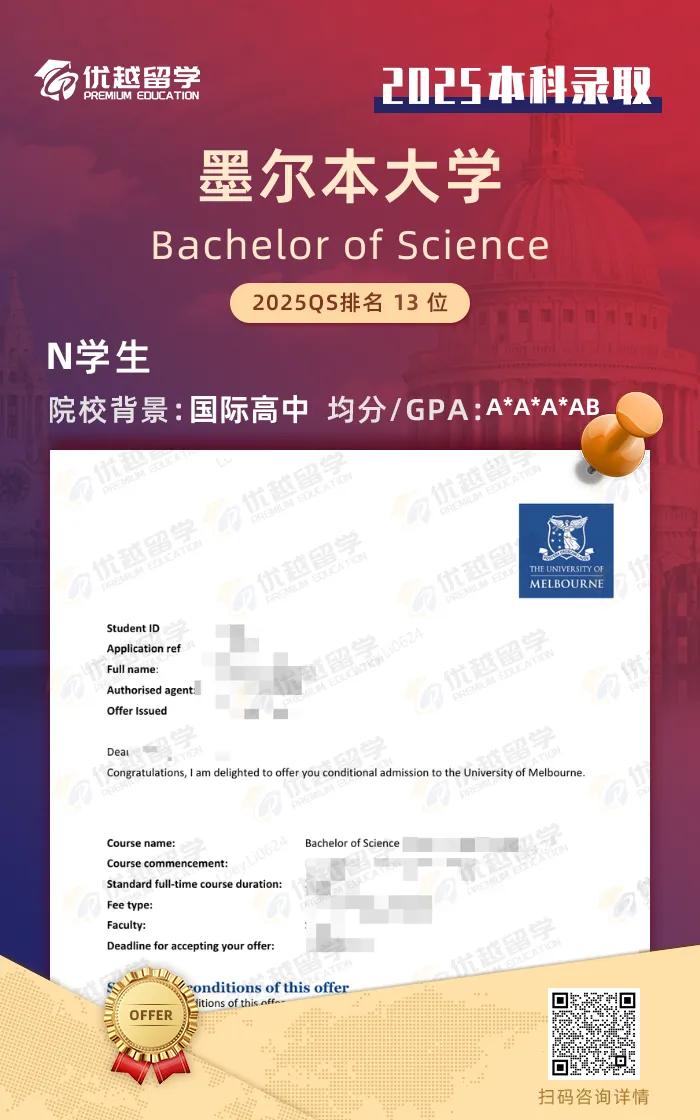 N同學在父母的規劃下一早準備本科出國留學,通過優越團隊精密的規劃,在25Fall申請季里,如愿拿下墨爾本大學科學專業的offer。今天就跟優越君一起,看看N同學是如何圓夢的吧!