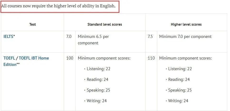 雅思 (IELTS) 要求:總分要求:7.0,單項最低分:7.0