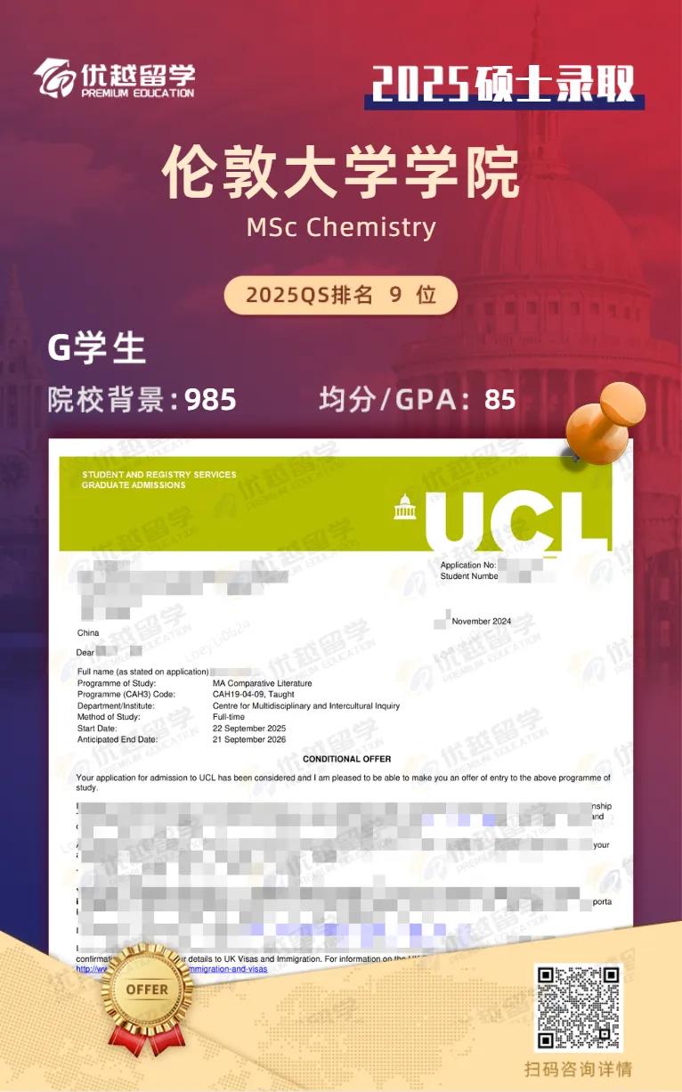 目標(biāo)和定校明朗后,G同學(xué)一方面提均分,一方面根據(jù)優(yōu)越的提分計劃刷雅思分?jǐn)?shù),在申請前,就已經(jīng)考到了達(dá)標(biāo)的雅思成績。終于,功夫不負(fù)有心人,10月下旬提交文書后,11月下旬就收到了UCL的offer!我們也祝G同學(xué)25Fall一切順利!