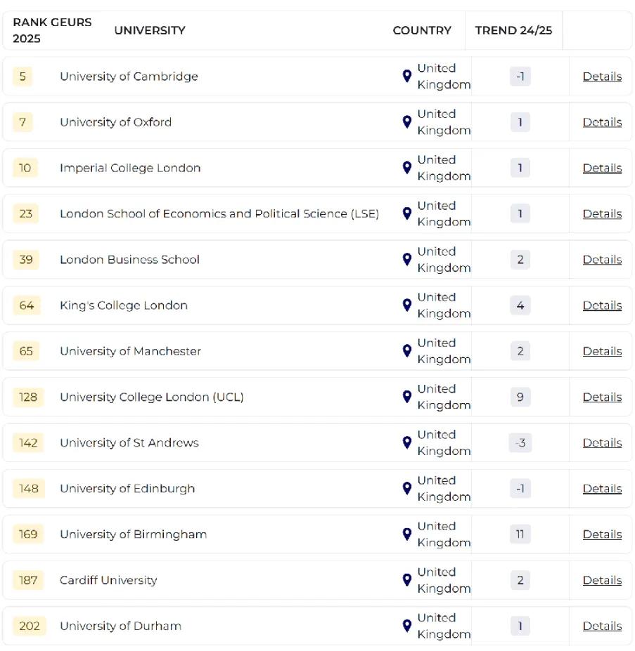在今年的排名中,英國共有 13 所大學上榜,多數學校排名上升,英國大學在全球大學就業力排行榜前十位中占據三個席位。