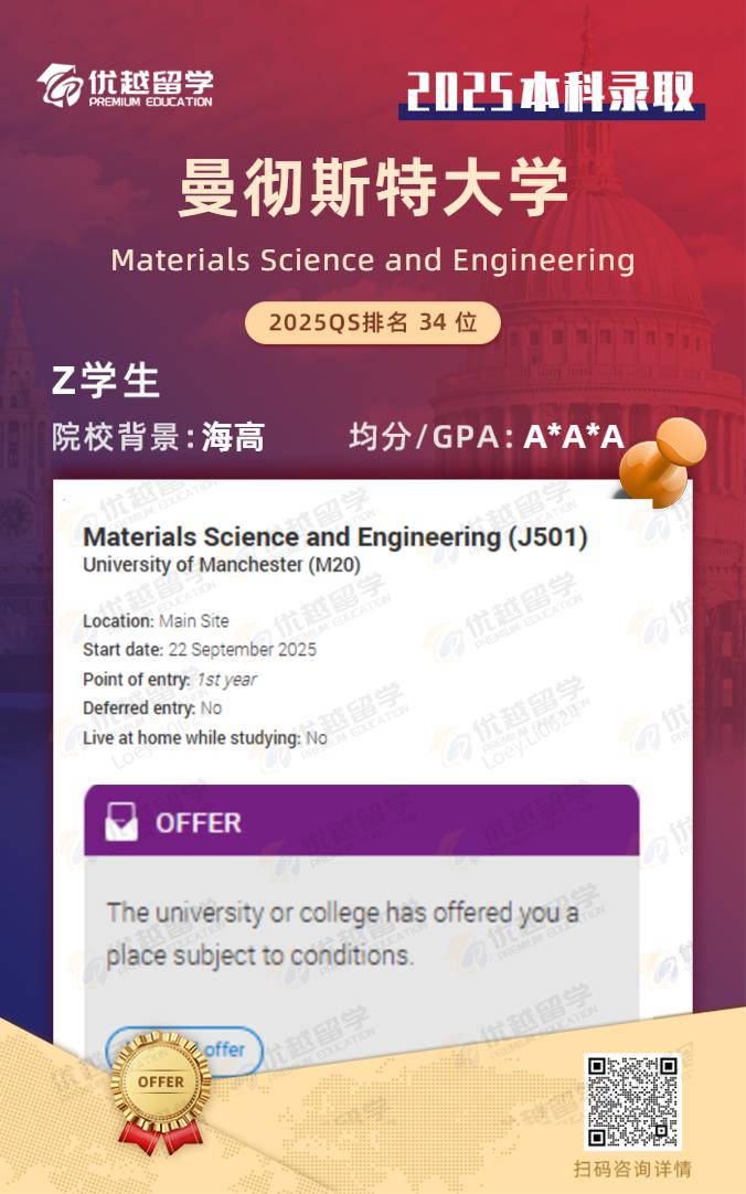 ?錄取院校及專業(yè):曼徹斯特大學(xué)-MSE材料科學(xué)與工程