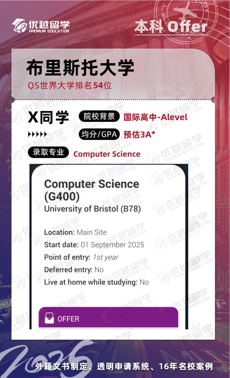 以上是【【本科案例】A-Level預估3A*,拿下布里斯托大學王牌計算機專業! 】相關的全部內容,查看更多【 本科留學申請】相關資訊可前往【優越留學】首頁!詳細申請規劃及方案定制請預約優越留學顧問為你一對一解答!