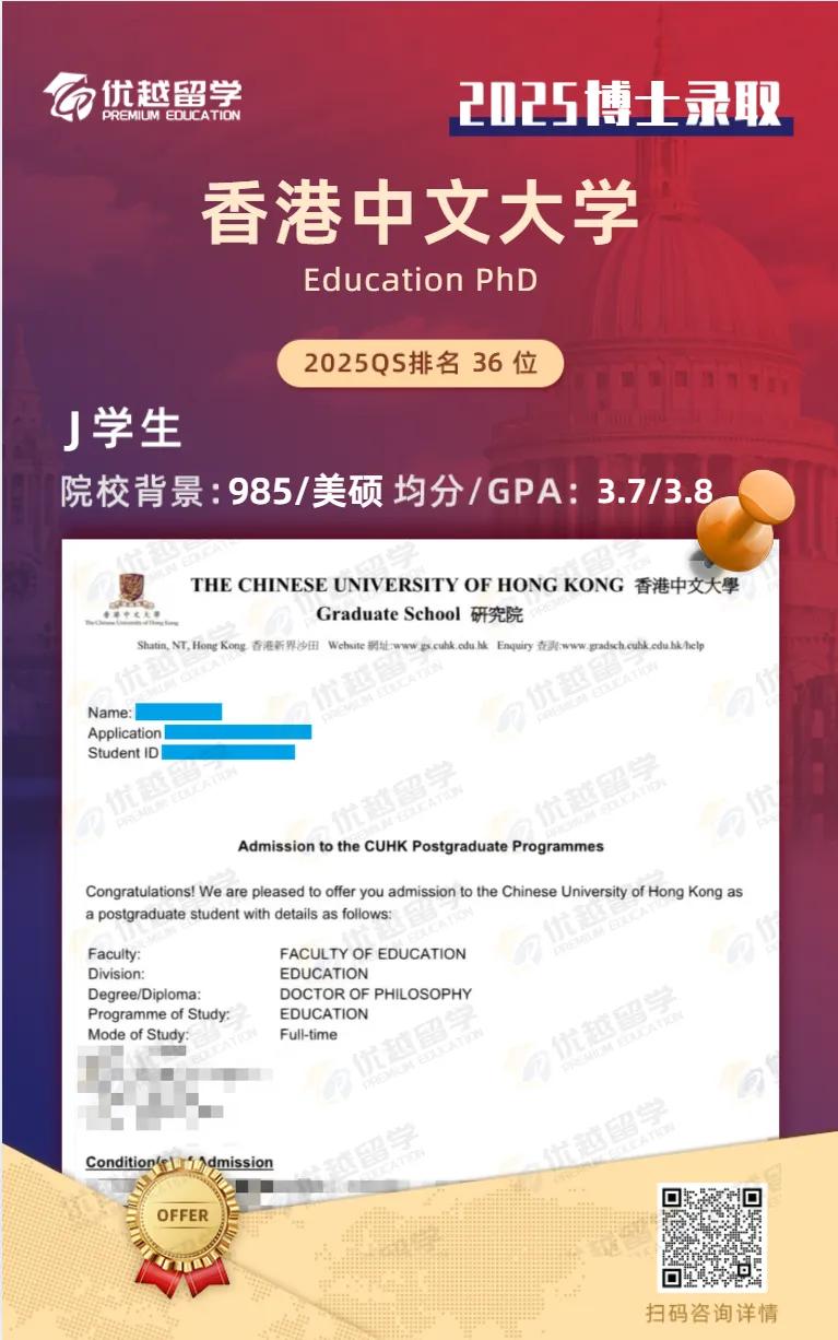 以上是【【博士案例】績點論文 “兩手硬”,自律大學霸叩開港中文CUHK教育學PhD 大門】相關的全部內容,查看更多【博士留學申請 】相關資訊可前往【優越留學】首頁!詳細申請規劃及方案定制請預約優越留學顧問為你一對一解答!