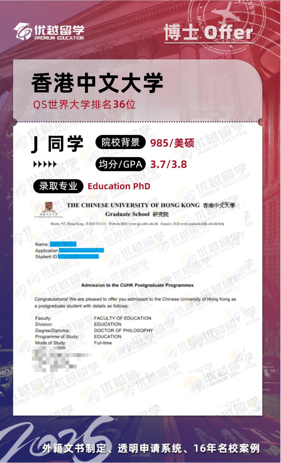 終于,在經(jīng)過(guò)長(zhǎng)時(shí)間的等待和持續(xù)不斷的努力后,好消息傳來(lái)。J 同學(xué)成功收到了香港中文大學(xué)教育學(xué)博士的錄取 offer!我們相信,其他offer也還在路上!我們也祝J同學(xué)科研生涯一切順利!
