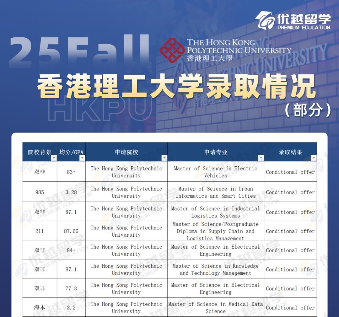 相比港三,港理工的錄取難度要低不少。985、211 院校的學生申請部分專業,均分 75 - 78 以上就有機會被錄取,雙非院校的學生有些專業均分 83 - 84 左右就可能拿到 Offer。所以對于那些均分不是特別高的同學來說,港理工的性價比真的超高。