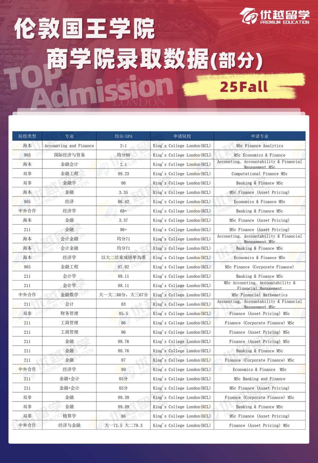 KCL 商學院沒有明確的院校名單限制,但對申請者的成績要求較高。非 211/985 院校的同學,平均分需要達到 90 分以上;211/985 院校的同學,平均分 85 + 更具競爭力。往年錄取的中國學生中,雙非學生比例約為 10%。優越留學的申請團隊擁有豐富的經驗,能夠幫助雙非學生挖掘自身優勢,制定個性化的申請方案,提高錄取幾率。
