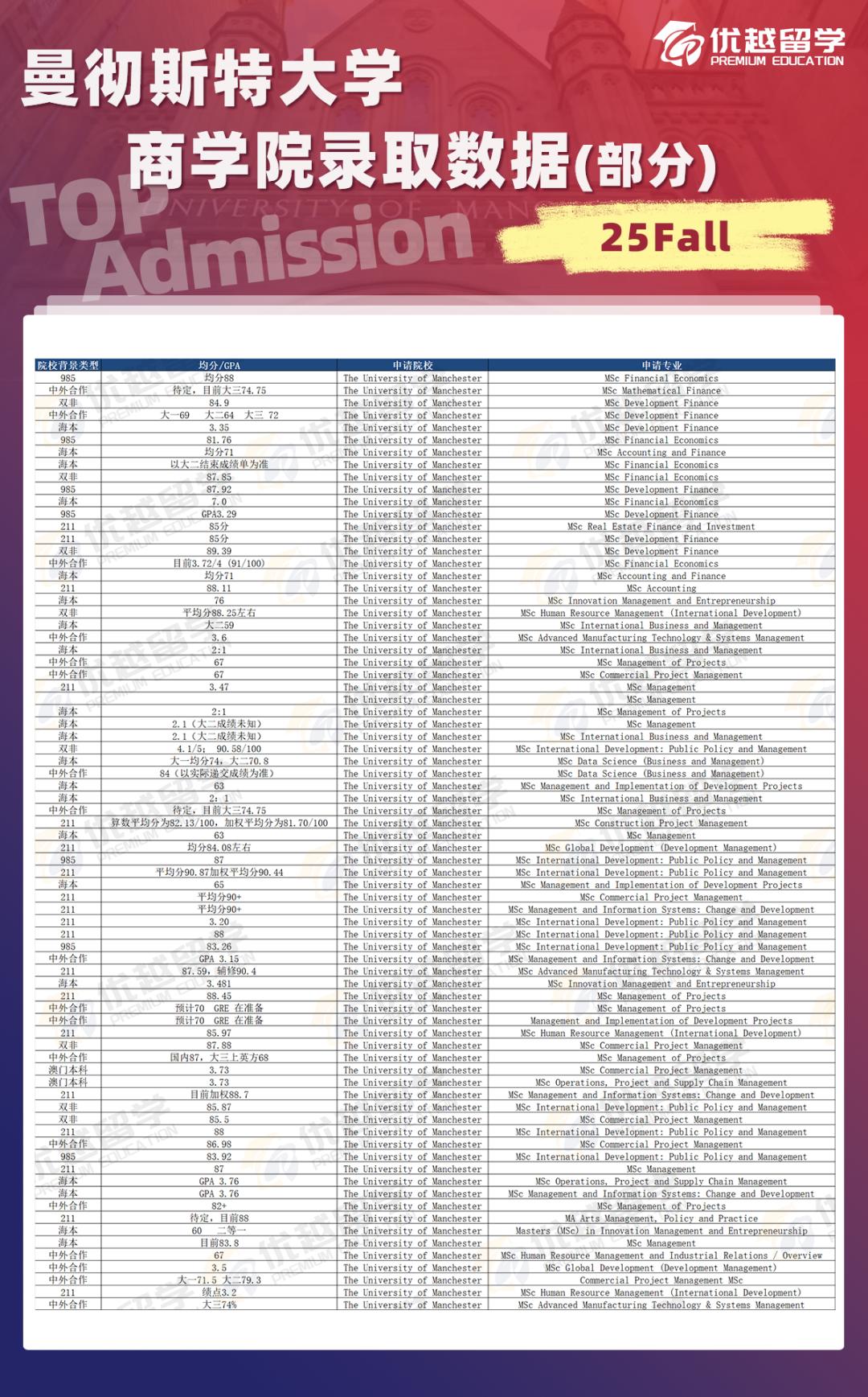 曼徹斯特大學商學院有自己單獨的 List,入學要求較高。一般需要英國 2:1 學位及以上或等同文憑,即在校成績排名專業前 15% 左右,GPA85 分(985 大學)或 90 分(211 大學)。申請時還需要帶雅思成績,要求雅思 7.0(小分 6.5)。優越留學熟悉曼徹斯特大學商學院的申請流程和錄取偏好,能夠為同學們提供精準的選校定位和文書指導,助力同學們成功申請。