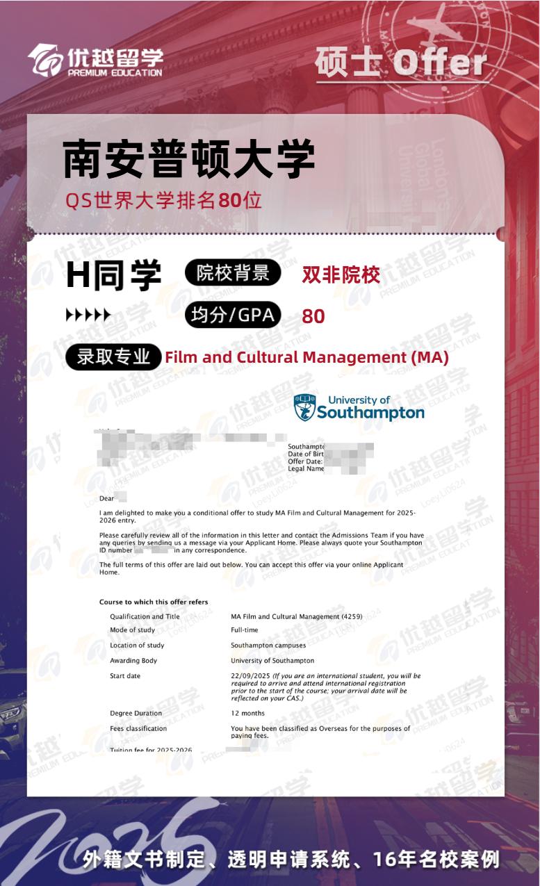 商學院、計算機學院、法學院、教育學院等熱門學院對雙非院校排名 X3、X4 的學生,均分要求為 80 分或 83 分。目前 25Fall 的 Offer 已經開始發放,在優越留學的幫助下,已有不少雙非同學成功拿到南安普頓大學熱門學院的錄取通知書。