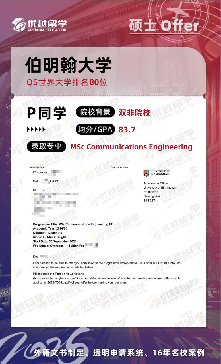 伯明翰大學(QS 排名 80)在 2025 年秋季申請季也降低了申請門檻,為雙非學生提供了更多可能。