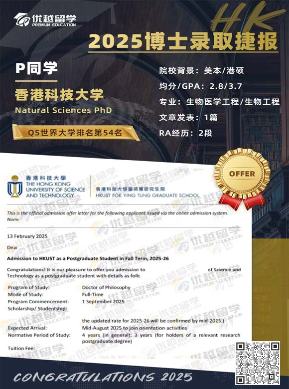 P同學是優越以前簽約的學生,美國讀完本科找我們申請了香港碩士,博士留學申請想繼續留在香港,最終如愿拿下香港科技大學博士offer!今天就跟優越君一起,看看這位同學是如何圓夢的吧!